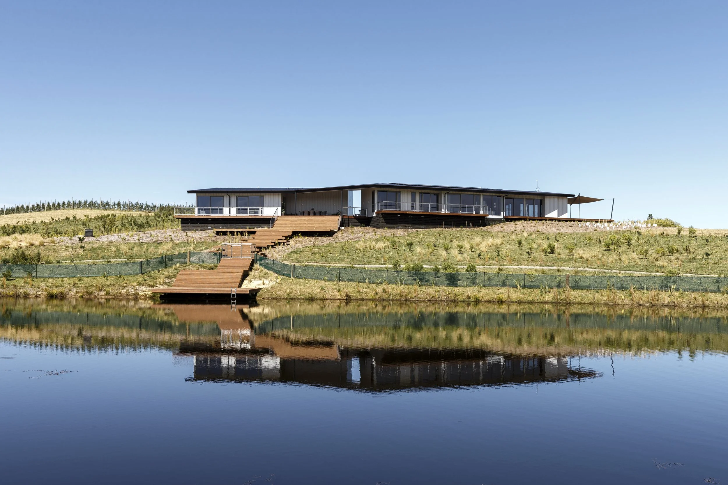 Located on the shores of the Waimea Inlet in Tasman, Bronte House is a contemporary lifestyle residence designed to engage directly with its coastal setting. The home sits lightly above its own pond, complete with a timber jetty for swimming and recreation, creating a seamless connection with the landscape.